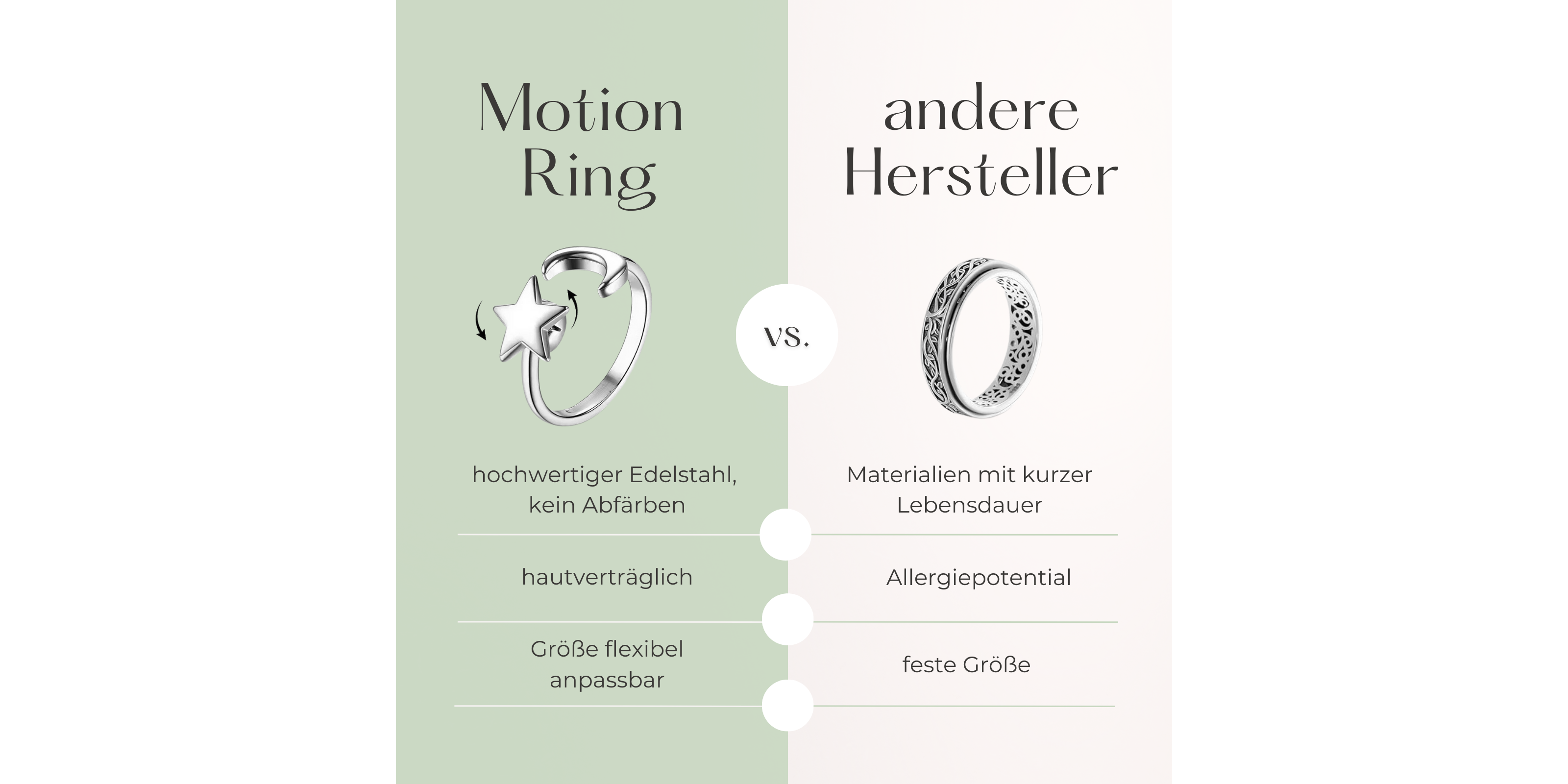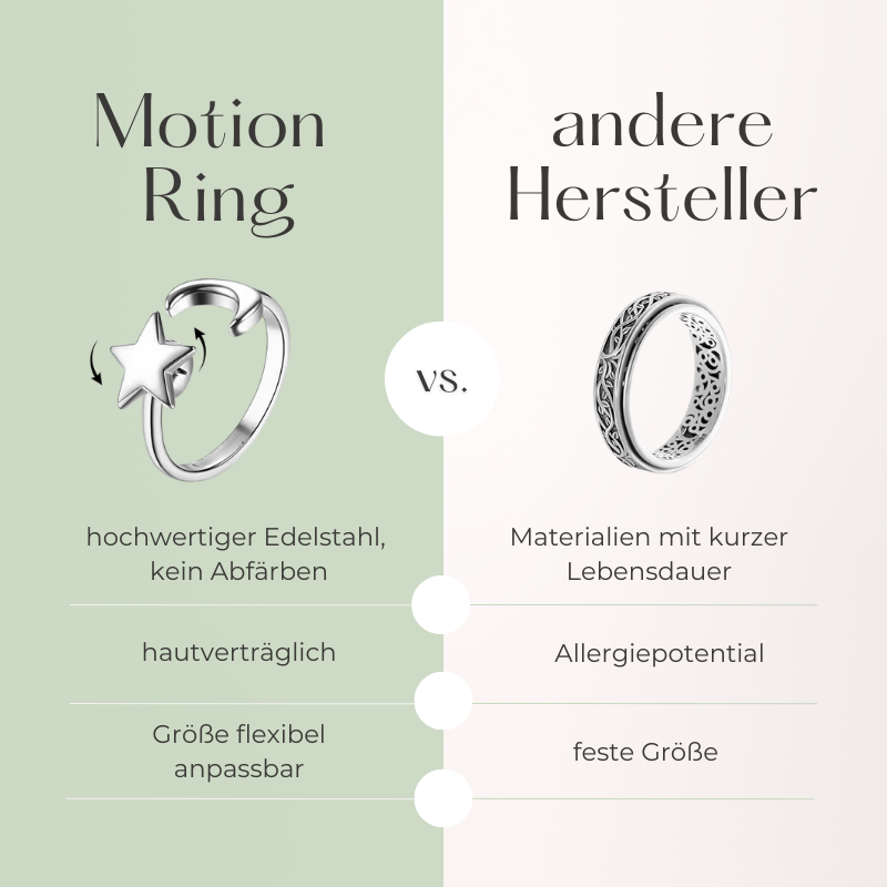 Der Motion Ring ersetzt nervöse Angewohnheiten wie das Kratzen oder Zupfen an der Nagelhaut durch eine sanfte, beruhigende Bewegung. Statt die Haut zu strapazieren, bieten die beweglichen Elemente eine gesunde Möglichkeit, mit Stress umzugehen – jederzeit und überall!